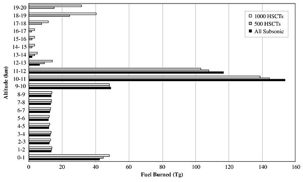 Altitude distribution of fuel burned-with and without HSCT fleet-based on IS92a scenario (Fa1,2).